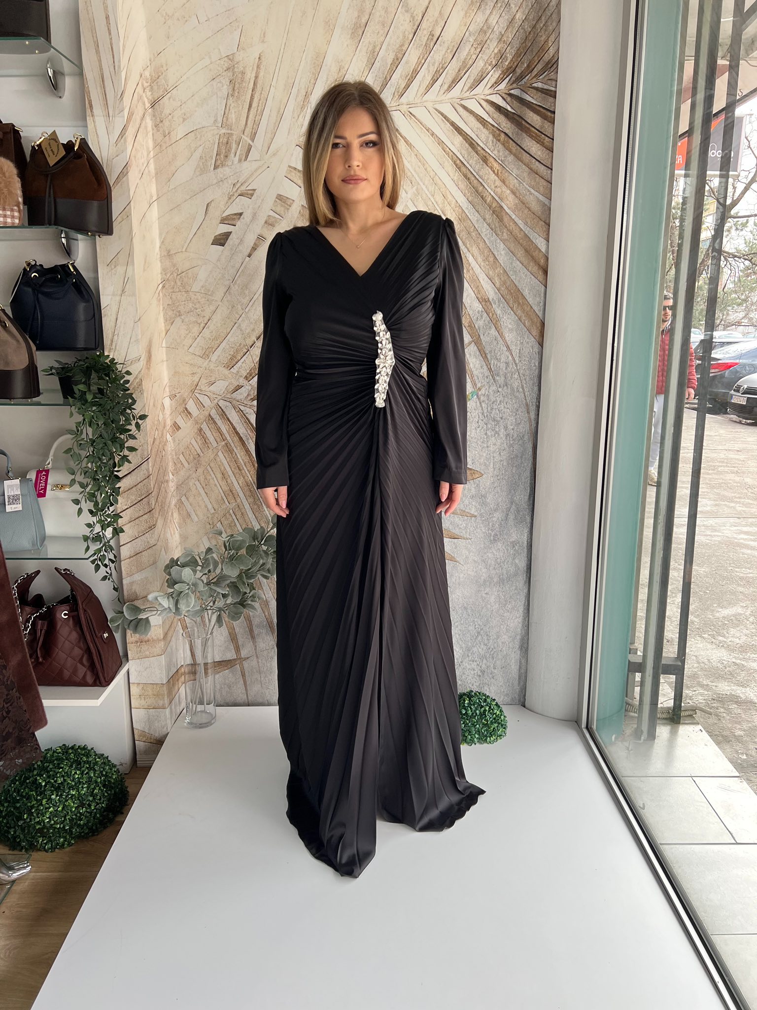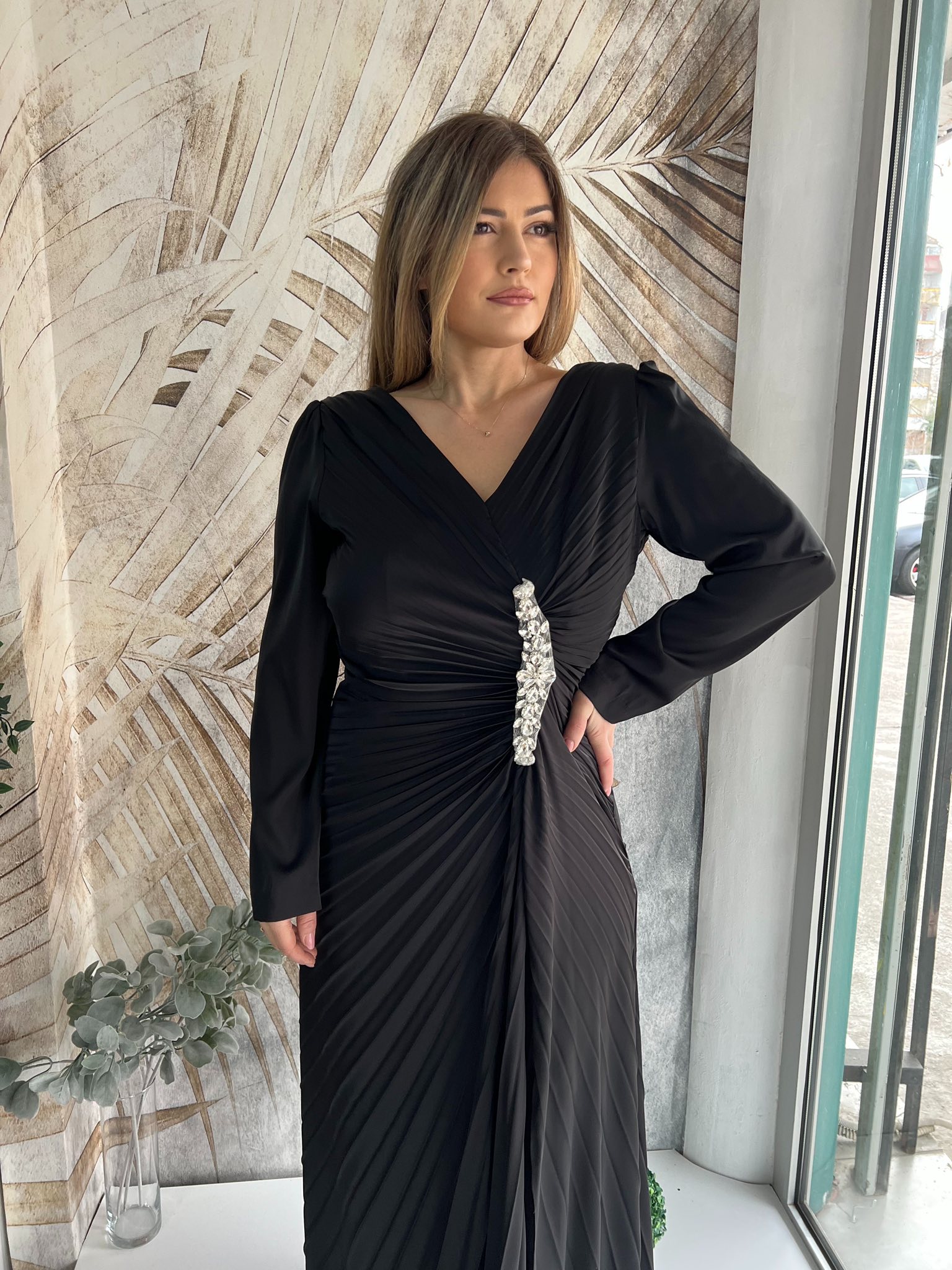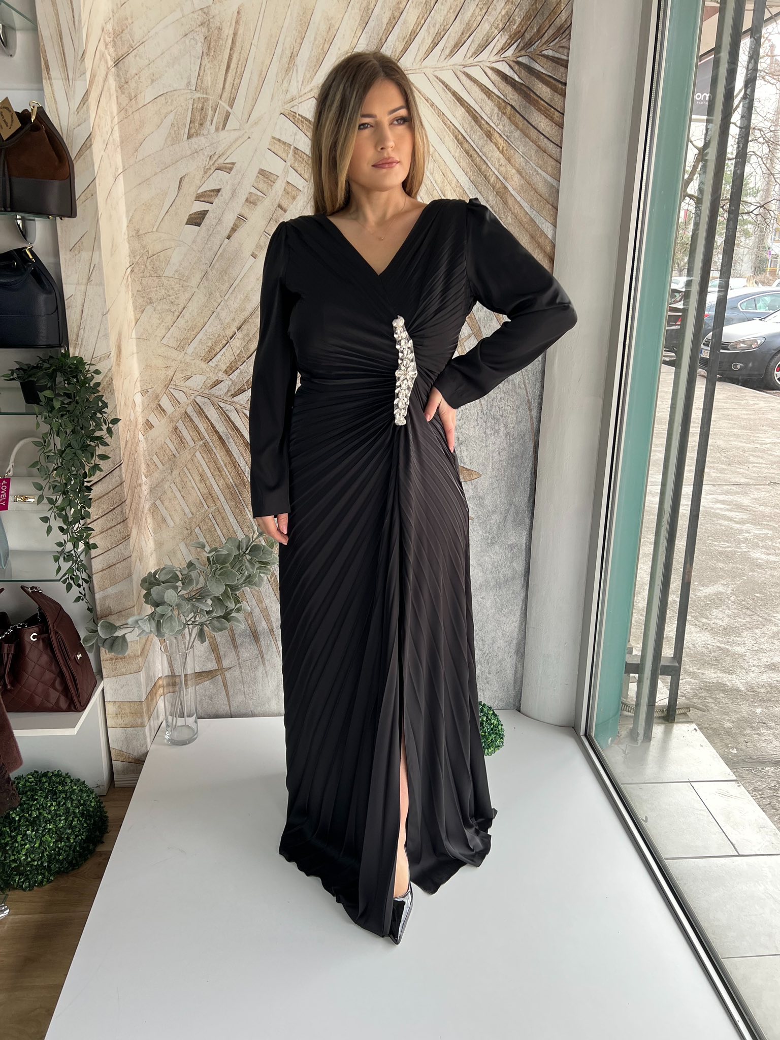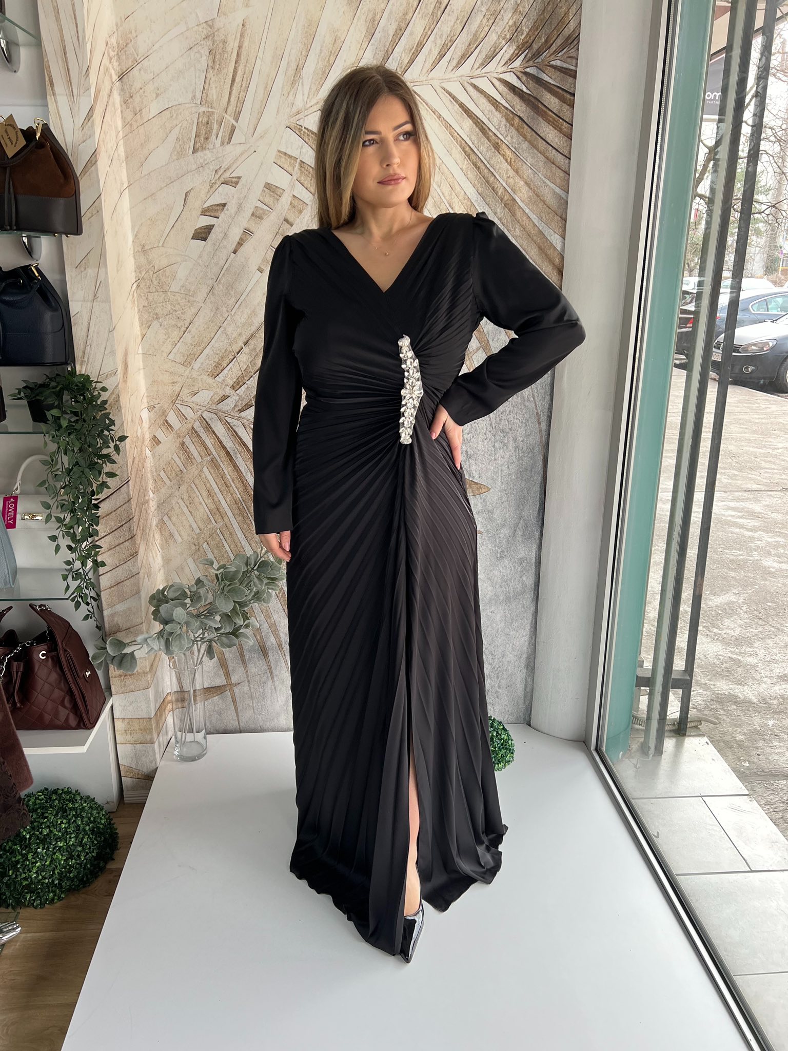 Duga crna haljina PLUS SIZE plise sa naglašenim strukom
