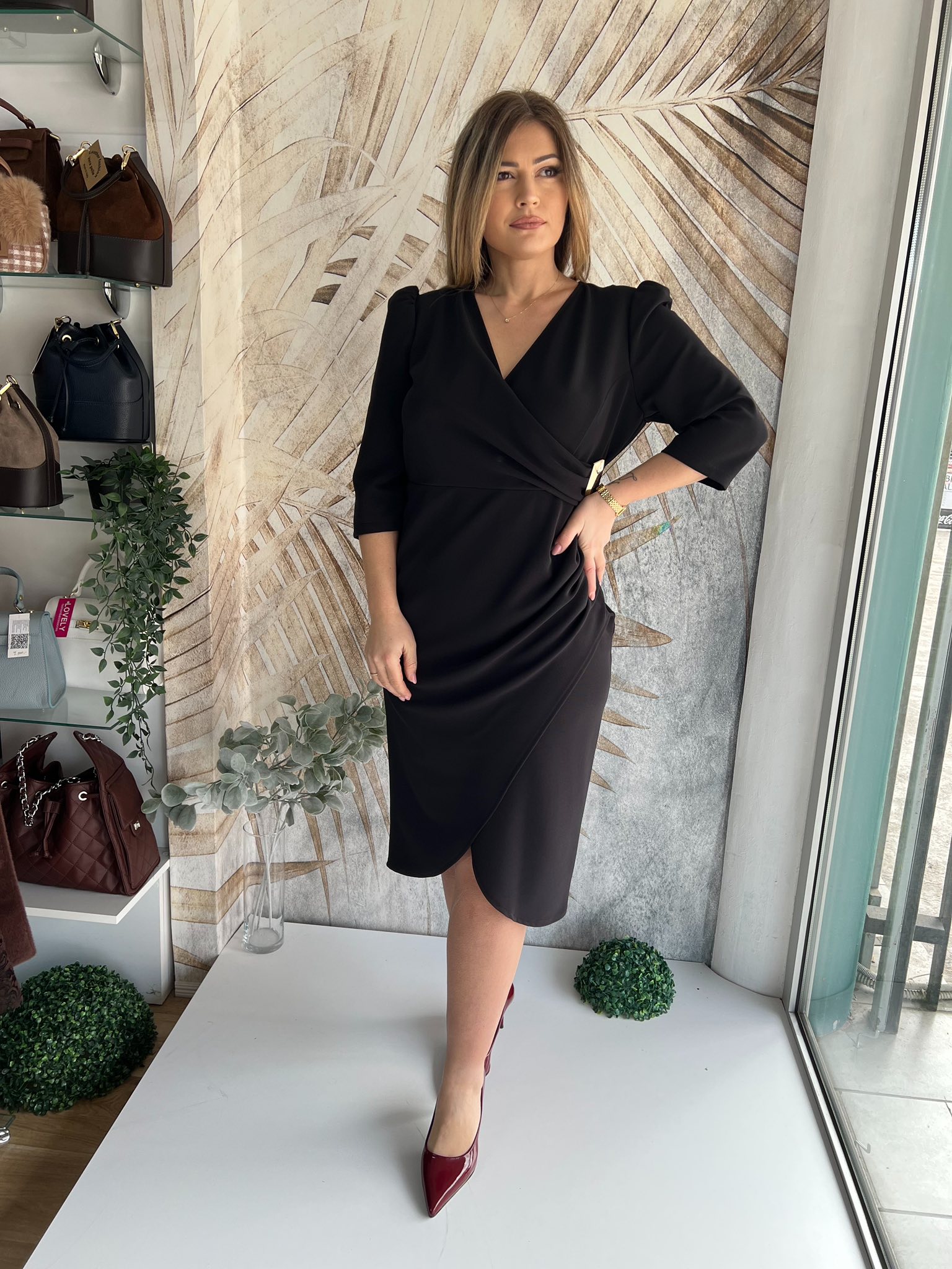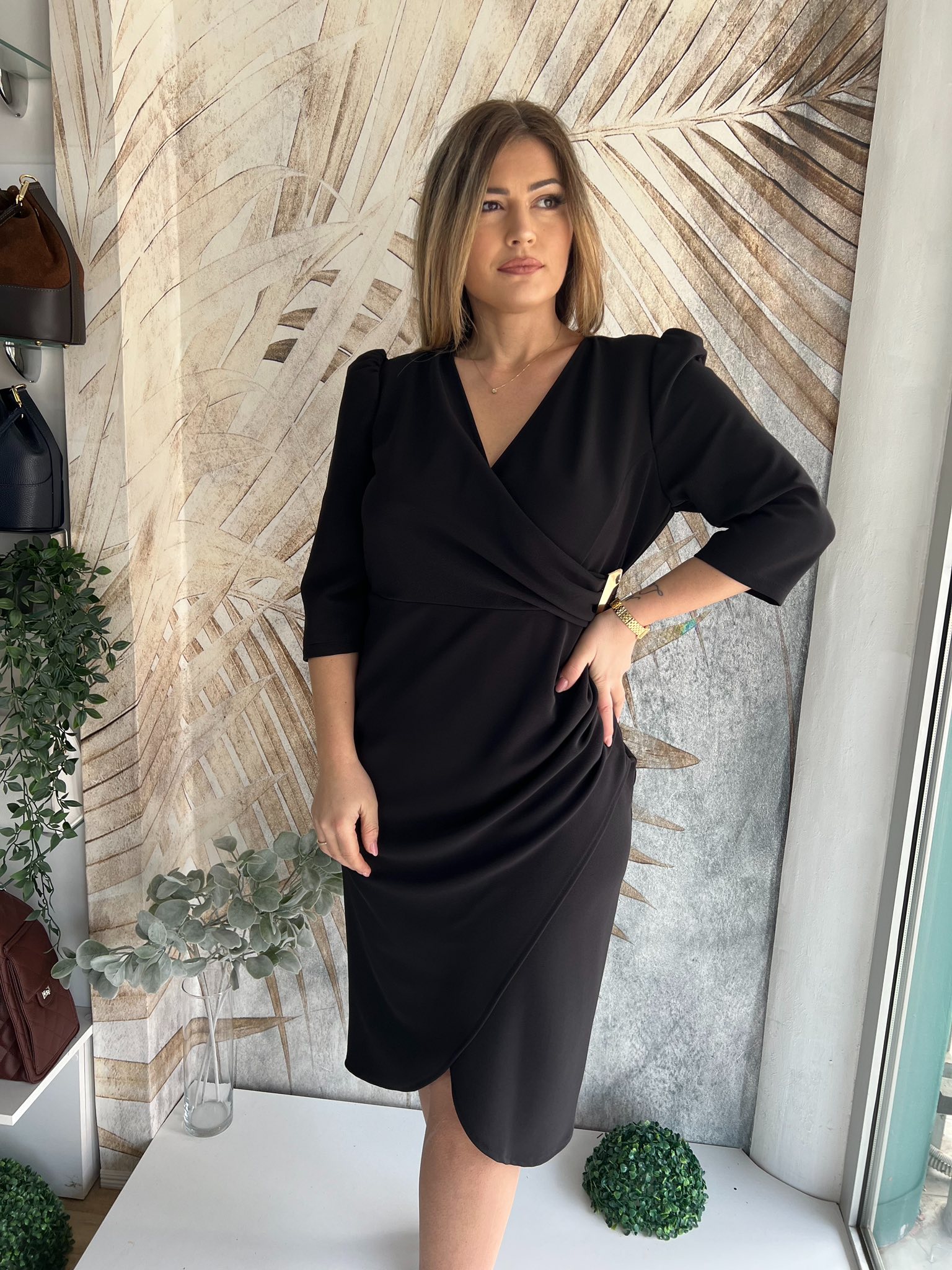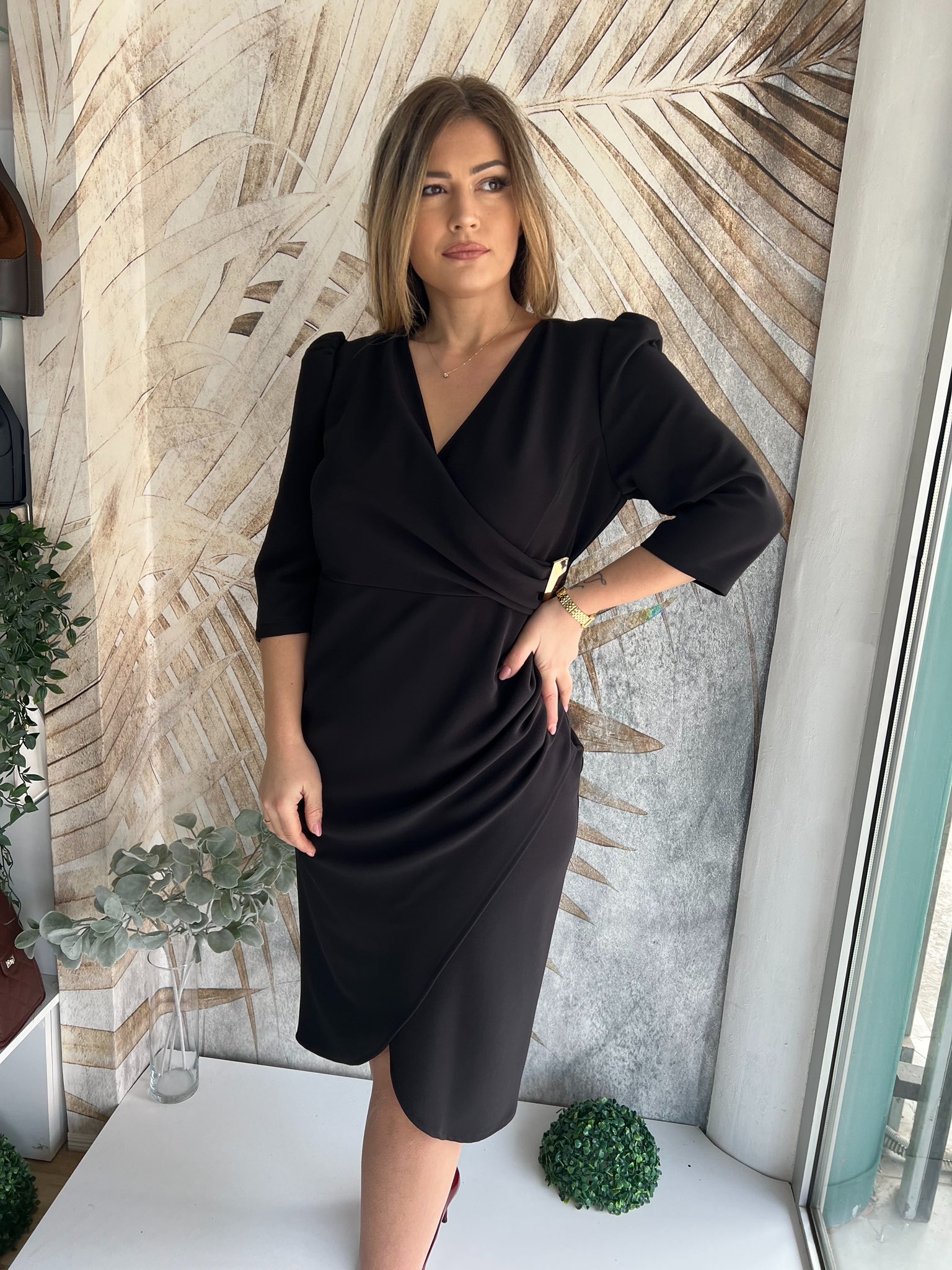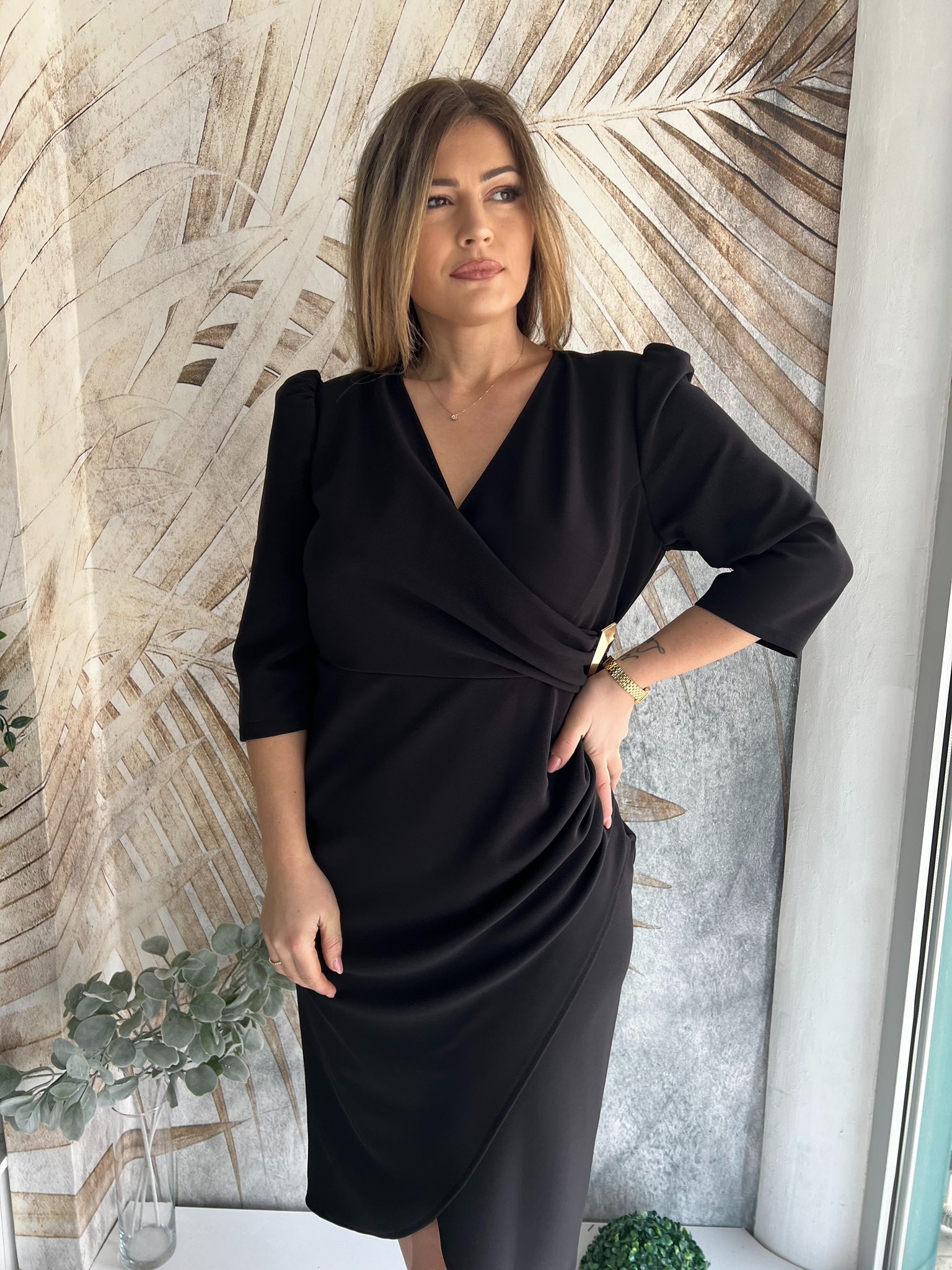 Haljina PLUS SIZE streč crna na preklop sa zlatnom šnalom (model midi 19)